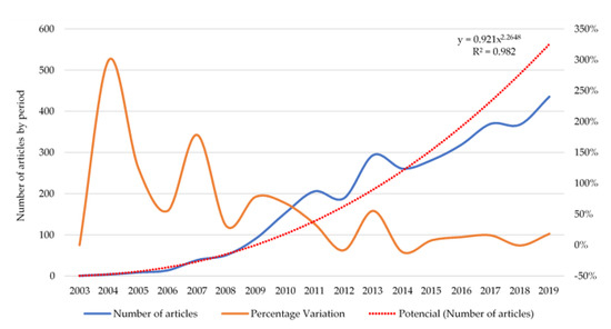A similar growth trend regarding the rest of analyzed variables can be observed. The articles analyzed in the sample obtained were written by 5877 authors. During the first period (2003–2008), 179 authors were identified, a number that increased in the following periods. From 2015 to 2019, this number increased to 3839, which represents 65% of the total sample of scholars contributing to the scientific production in the period of study. This increase is expressed in the average number of authors per article, which goes from 1.6 in the first period to 2.6 in the final period, demonstrating the increased interest that this phenomenon has aroused in scholars. The number of authors publishing in this field of research has increased at a higher rate during the last period analyzed than the number of published articles.