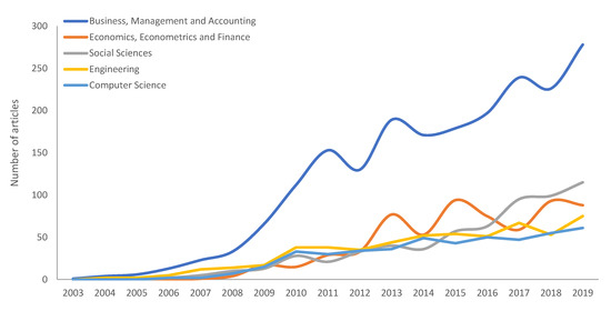 Figure 3 shows the evolution of the five main categories in which the articles about open innovation (including the ones related with sustainability) are framed. The most significant subject area is Business, Management, and Accounting, which includes 2020 articles and represents 36% of the total sample. In this category, more than half of the articles are classified due to a direct relationship between the field of study and the subject area, since the open innovation paradigm has been mainly studied in relation to firms, their dynamics and the processes associated. This is also because of the main classification of the most important and prolific journals that have awakened an interest in publishing about the concept. Economics, Econometrics, and Finance occupies the second position with 638 articles (11.3%), and it was not until 2013 that it gained relevance in the field and established itself in this spot. The subject of Social Science came in third place with 618 articles while representing 11% of the total sample. Since 2017, this third-place finisher has surpassed the second-place category. This may be due to the increase of sustainability-related publications in the last several years, which are usually categorized within the subject of Social Sciences.