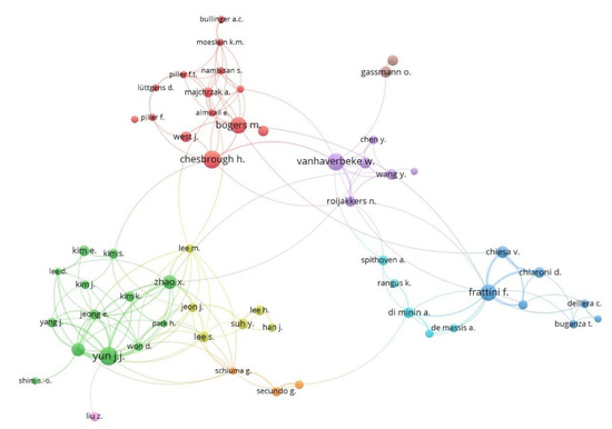 Figure 4 was made with the VOSviewer tool. It represents the collaboration network between the main authors. Authors in close proximity within the diagram have closer collaboration and the size of the bubble indicates the relevance of the author within the network of collaboration. Four main collaborative groups have been found, each one led by one of the four most relevant authors per number of papers and citations. These authors are presented in Table 3, Vanhaverbeke (purple), Chesbrough (red), Frattini (blue), and Yun (green). In some of the groups, the country or region of origin appears to determine the collaboration. For instance, most of the authors of the green network are from South Korea and those of the blue network are from Italy.