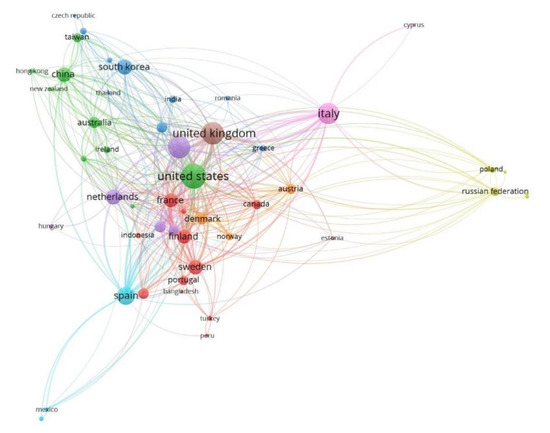 The links between authors, research institutions, and countries were measured using some network indicators, such as the analysis of coauthorship through processing tools and network maps of known reliability and suitability for bibliometric analysis. The keyword analysis detected present and possible future research topics or concerns through the analysis of co-occurrences. This is possible given that scientific papers can be reduced to a set of joint occurrences between the words appearing in each article. For the analysis of these network indicators, the VOSviewer software tool (version 1.6.10., Leiden University, Leiden, the Netherlands) was used. This tool provides data on interactions and content evaluation to measure research network activities [74,75].