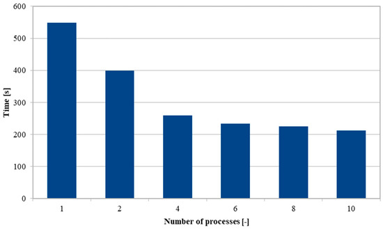 | Number of Threads/Processes (-) | Computational Time (s) | Computational Time (m:s) |