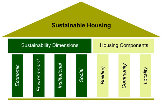 A straightforward way to define sustainable housing follows the Brundtland Commission’s definition. Thus, sustainable housing can be defined as “housing development that meets the housing needs and demands of the present generation without compromising the ability of future generations to meet their (housing) needs and demands” [7]. However, such a definition would face the same critique as above for its vagueness, ambiguity, and lack of consensus on what is to be sustained and what to be developed [23,24,25]. A review of relevant definitions of sustainable housing distinguishes several approaches to the sustainable housing conceptualization.