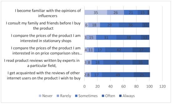 The majority of respondents indicated that they are familiar with the opinions of other Internet users about products they want to buy. As many as 74% of respondents do so always or often, while the average score on a scale of 1 to 5 was 3.86. Equally often, respondents indicated that they read product reviews written by experts in a particular field, but also that they compare the prices of the product they are interested in on price comparison websites (averages of 3.82 and 3.76, respectively). On the other hand, respondents read the opinions of influencers much less frequently (only 3% of respondents always do so, while 35% never do). In this case, the average score was only 2.25. Determining the frequency with which prosumers follow product reviews published by other Internet users when they make final decisions about buying organic products was an important element of the research analysis (see Figure 2).