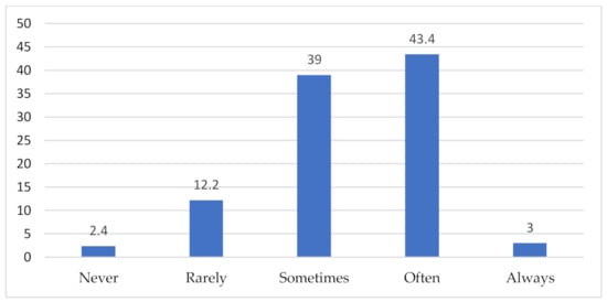 Determining the frequency with which prosumers follow product reviews published by other Internet users when they make final decisions about buying organic products was an important element of the research analysis (see Figure 2). The results show that respondents do this slightly more often than with family and friends. It was found that 43.4% of the prosumers interviewed often display this type of behavior, 39% of those interviewed do so from time to time, while 12.2% rarely do so. The answers “never” and “always” accounted for 2.4% and 3% of the indications, respectively.