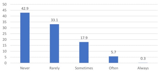 42.9% of respondents stated that they never urge other Internet users to make a decision to buy organic products on the basis of their own experience. Almost a third of the respondents rarely take such measures, while 17.9% do so from time to time, 5.7% frequently and 0.3% always (see Figure 4).