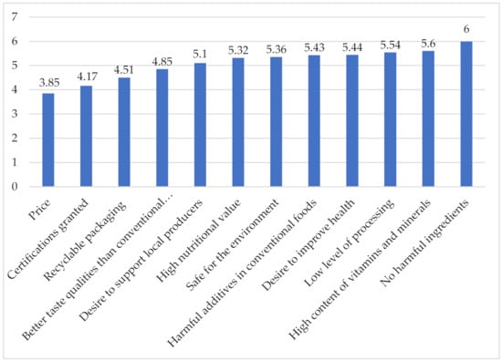 Factors that induce Internet prosumers to buy organic products were also examined. An ordinal scale was used for this purpose. It helped to sort the answers according to their importance for the respondents, but also to identify the characteristics with the greatest intensity. These factors were then ranked from the lowest to the highest importance. To do this, the average value of the answers given by the respondents, as shown in Figure 5, was taken into account.