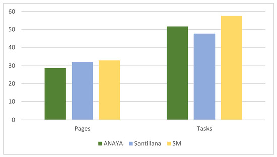 Comparison, by publisher, of the mean number of pages and tasks containing aspects related to environmental education. Source: own preparation.