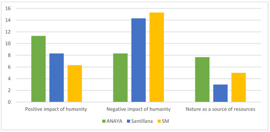 At format level, the proportion of images depicting a negative human impact on nature is especially greater in the higher grades in the books published by Santillana and Anaya (Figure 2). Images that show the utilitarian value of nature are more numerous in Anaya textbooks (6th pri. An. p. 64).