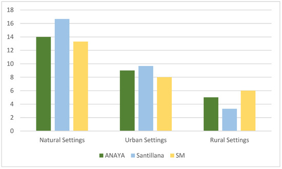 The settings most frequently addressed by all the publishers when addressing environmental education are natural environments, followed by urban and rural ones (Figure 3).