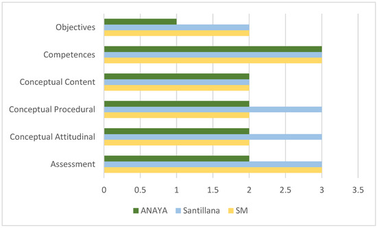 The data obtained through the content analysis yield conspicuous differences between publishers (Figure 4). All the publishers score above the mean on competences, attitudinal content, and evaluation. However, there are differences between publishers in the other three items. Santillana rates highest in all the sections, scoring above 2 in five of the six categories, with a score of 2 in the other category. Anaya and SM are weak on objectives and conceptual and procedural content. Conceptual content on environmental education is the weakest category across the three publishers.