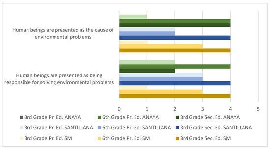 The notion that humanity is responsible for our current environmental problems is, drawing on the data collected, watered down in the early grades of compulsory education but grows in focus as we go up through the education system. Nonetheless, despite these elements being treated as fact, this is not done as rigorously as an objective vision requires. This is because many books strive to counter these circumstances by showing an image of humanity as committed to solving these environmental questions and transmit the idea that their actions have a positive impact, which, in practice, presents an unreal scenario. This coincides with the conclusions drawn in [44,45], although, as mentioned, as the education system progresses, at least in the case of Spain, the viewpoint becomes more objective.
