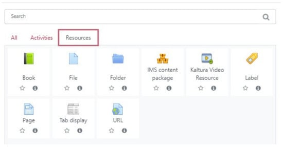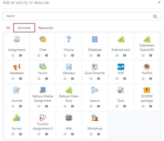 A first aspect to consider is that the mere use of LMS will not in itself ensure effective teaching. Effectiveness appears to depend on what learning objects (resources and activities) are used and the way that they are implemented within a particular group of students [2,8]. Among the tools that LMS offers, some have shown themselves more effective than others, depending on the type of student and the characteristics of the content to be learned [9]. It is necessary to study the type of learning object that is applied and its usability for a student or group of students [10]. The results of this investigation highlight the personalization of the teaching proposal as a key to successful teaching-learning processes in on-line teaching environments [11]. This fact implies that the teacher has to use various learning objects within the LMS in order to provide a response to the learning needs of each student. Hence, the need, first of all, is to study the possibilities that LMSs have to offer. For example, an LMS similar to Moodle (Modular Object-Oriented Dynamic Learning Environment) offers two teaching possibilities: resources and activities [12], which facilitate interaction between teacher and students, the students themselves, and the students with the resources and activities [13]. The resources refer to “objects” (in Information Technology (IT) terms) that a teacher can use as assistance in the teaching–learning process. A description of Moodle resources may be consulted in Table A1 (Appendix A). Likewise, Moodle offers activities that are tasks that the student can complete alone or in interaction with other companions. The tasks can be evaluated and the teacher can provide feedback both on the product and on the problem-solving processes of a student or group of students (see Table A1). In Figure 1 the resources and in Figure 2 the activities that Moodle offers are shown, including some from the personalized Moodle platform for the University of Burgos (UBUVirtual).
