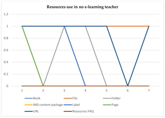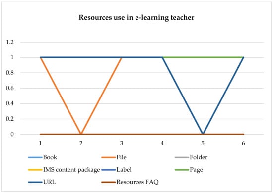 A non-parametric statistical test, the Mann–Whitney U-test for independent samples [type of teacher (expert in e-Learning vs. non-expert)], was applied to test RQ1, as it involves a sample of n = 13 teachers. Significant differences were found for the use of resources, specifically those of ‘Label’ and ‘Page’ (see Table 2). The teachers used 5 resources of the 8 that Moodle v.3.8 has to offer, which implies a percentage utilization of 62.5%, without there being a difference in the variable type of teacher (expert in e-Learning vs. non-expert). The resources used as a function of this variable may be consulted in Figure 3 and Figure 4.