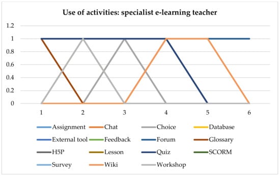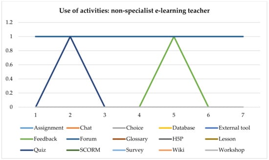 The Mann–Whitney U-test for independent samples was applied to test RQ3. No significant differences were found for the utilization of activities to which both types of teachers had access on Moodle (‘Assignment’, ‘Feedback’, ‘Forum’, ‘Glossary’, ‘Quiz’), only a tendency towards a difference in the utilization of the ‘Quiz’ activity (see Table 4). In addition, the teachers utilized 66.66% of the activities available on Moodle v.3.8. In this case, differences were detected for the percentages of use of the range of activities. The non-expert and the expert e-Learning teachers, respectively, utilized the learning objects at levels of 33.33% and 66.66%, respectively (see Figure 5 and Figure 6).