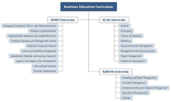 Business education curricula in Russian Presidential Academy of National Economy and Public Administration (RANEPA) University, KIMEP University, and Al Ain University. Source: developed by the authors on the basis of [51,52,53].