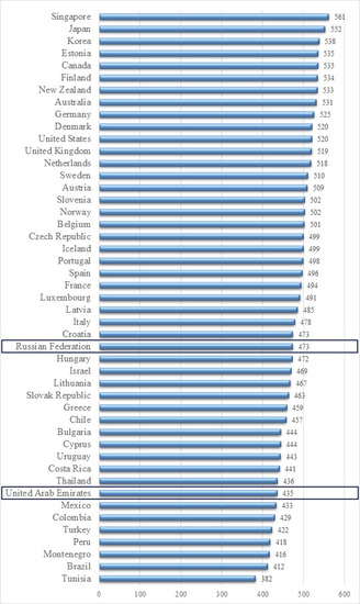 On the other hand, the achievements of Russian scientists are still considerable, but a continuing decline in education quality has a demolishing effect on them [50,54,57,58]. Eric Hanushek and Luger Wessman associate the outperformance of top OECD countries with the technology-induced economic and sustainable development. In turn, any positive tendencies in economy and sustainable development are a total effort of high professional and educated residents. The collaborative problem-solving assessment explores the level of student readiness for collaboration and skills to solve complex problems in more than 130 countries of the world. Figure 2 shows the related PISA results, which were discussed above [54].
