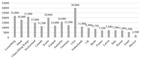 According to scientists, business and entrepreneurship education is a powerful tool to create long-term forecasts of national strength and sustainable development [9,14]. Undereffective education policy and poor education lead many countries to the point of permanent recession. The idea of OECD surveys is to give as many countries as possible, both rich and poor, the opportunity to compare the state of their education with world leaders, determine their strengths and weaknesses, and see what the long-term economic benefits of improving education quality will be. The experts complying draft rankings put forward a thesis that the quality of education, both in general and business-oriented, is dependent upon national welfare (Figure 3).