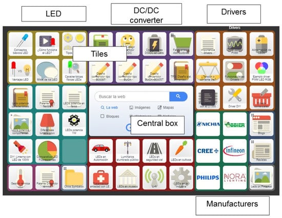 A PLE could be built using social networks, office packages, or other generic software. However, there are online tools which may promote the design of a PLE, such as Symbaloo, Ning, Gnoss, Netvibes, etc. Previous works [39,40] have found that Symbaloo could be the most suitable tool because it is free for basic users, easy to handle, and intuitive, and it can also be integrated with other tools [41]. Symbaloo is a bookmarking tool with which resources and links are managed on a website called a “Webmix”. A Webmix has a grid layout with a central box and collection of squares, called tiles. Each tile may have a specific content: a URL, a news feed, a widget (calculator, weather, etc.), or a pdf file or video. Tiles can be easily grouped according to topic using different colors.