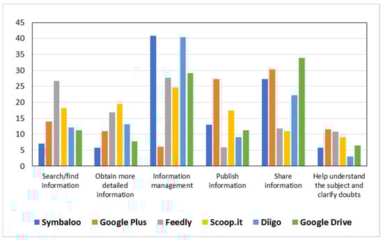 The disaggregated survey results were used to identify the usefulness of the tools (Table 4 and Figure 4). Overall, the uses were for information management (28.15%), to share information (22.77%), to search/find information (14.9%), to publish information (14.02%), to obtain more detailed information (12.32%), and to help the students understand the subject and clarify doubts (7.81%).