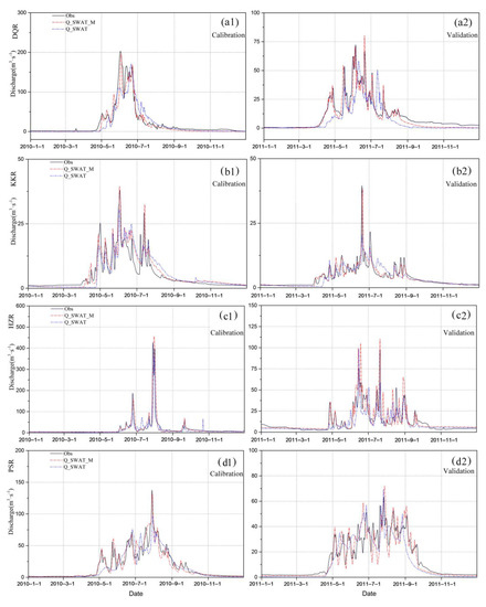 Simulation results of different river basins on a daily scale ((a1–d1) represented the Daqing River Basin (DQR), Kaiken River Basin (KKR), Heizi River Basin (HZR), and Pishan River Basin (PSR) at calibration rate simulation results, and (a2–d2) were the simulation results of the validation periods).
