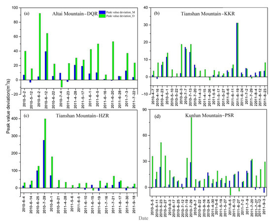Comparison of flood peak deviations in different basins (a), DQR in Altai Mountain; (b), KKR in Tianshan Mountain; (c), HZR in Tianshan Mountain; (d), PSR in Kunlun Mountain).