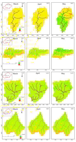 The distributions of the NDVIs of each basin from March to May in spring were compared and analyzed in Figure 6. In the DQR, the vegetation regeneration in March was mainly concentrated in a small area in the middle of the basin. In April, the vegetation gradually began to regenerate in the middle and lower reaches of the basin. By May, both sides of the river and most of the middle and lower reaches of the river were basically covered by regenerated vegetation. In March, the vegetation in the KKR was mainly distributed in the catchment area upstream of the basin. In April, the vegetation regeneration accelerated and the vegetation area increased in some of the downstream areas. The vegetation in the lower reaches of the basin increased in May, and the vegetation area expanded. The same situation occurred in the upstream watershed. In the HZR, the vegetation distribution in March and April was mainly in the upper reaches of the basin, but in May, the vegetation returned, the vegetation area in the upper reaches of the basin expanded, the vegetation distribution also appeared in the middle reaches of the river convergence, and the new vegetation appeared in the downstream outlet area. Compared with the other three basins, the vegetation regeneration time in the PSR obviously lagged behind. The Pishan River, located in Kunlun Mountains, with least precipitation among the four basins and was a typical representative of the rivers in the arid region. There was less rainfall in spring and the water needed for vegetation greening was mainly from melting snow in high altitude mountain areas [22,58,59]. The altitude was so high and meteorological conditions were so complicated that the temperature began to rise, the snow began to melt, and the river runoff increased until in April [60,61]. The vegetation regeneration was started when water source was plentiful. Due to the altitude and complex meteorological conditions, vegetation regeneration in Pishan River Basin was late and obviously lagged behind [62]. The time of snow melt in each basin can be accurately located by studying the time of vegetation regeneration in each basin. As the main water supply, the amount of snow melt affects the vegetation regeneration and growth, and there is a significant relationship between them. Therefore, the accuracy and rationality of the model modification can be verified by establishing the correlation between NDVI and snow melt. The NDVI data for May showed that the vegetation area had significantly expanded, the vegetation regeneration had also accelerated, and there was a significant distribution of vegetation in the upstream and middle reaches of the basin.