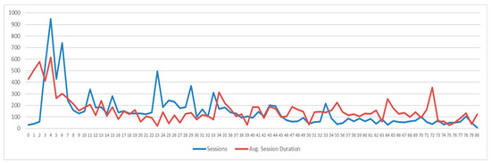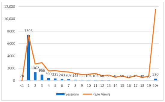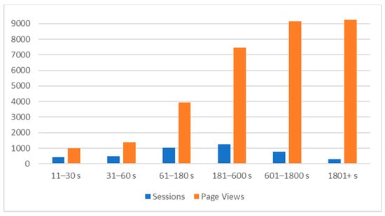 In our case, the page views and session metrics provided data on how effective the site content was at keeping viewers on the site and engaged. In the below figure (Figure 2) it is observed that the longer the session duration is, the higher the page views are. We did not take into consideration sessions 0–10 s since most of them came from spam traffic sources. The most common pattern of viewing was sessions that lasted 181–600 s each (3–10 min), followed by sessions that lasted 601–1800 s (10–30 min). In 381 sessions, the viewer’s attention was kept for longer than 1801 s (30 min).