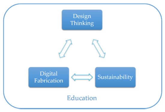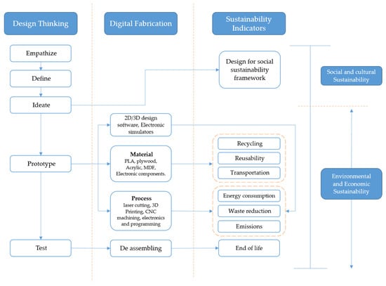 The above studies explore social, environmental, or economic aspects of sustainability but do not investigate all these aspects together. Digital fabrication tools used for prototyping are not only relevant at the higher education level, but also for STEM and primary education [20]. Despite its importance, no study has addressed sustainability and prototyping-based digital fabrication tools in the design education context. A conceptual framework focusing on all major aspects of sustainability in digital fabrication-based prototyping in the educational environment has yet to be proposed to fill this research gap. Therefore, the objectives of the present study are: firstly, based on existing literature, to propose a conceptual framework that combines design thinking, digital fabrication-based prototyping, and sustainability and secondly, to test this comprehensive conceptual framework empirically in the context of design education. It is expected that the present study will allow a deeper understanding of the contribution of sustainability to digital fabrication during design problem-solving, with important implications for education environments such as design courses dictated in FabLabs. The outcomes of this study will encourage designers, instructors, and students to become more aware of the importance of sustainability in the digital fabrication process. For the scope of this study see Figure 1.