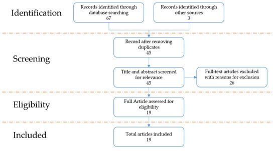 To explore the existing work on sustainability issues in digital fabrication-based projects, a comprehensive literature review is conducted. After inspecting the scope of this topic, four major keywords were identified: prototype or prototyping, sustainable or sustainability, digital fabrication, and design education. Carrying out an initial search using prototype or prototyping keywords led to too many results, and using all four keywords at once ended up with only a few outcomes. Hence, it was decided to stick with sustainable or sustainability and digital fabrication keywords to gain a comprehensive view of the literature on sustainability issues in digital fabrication. A logical approach was adopted to find relevant peer-reviewed articles available on the Scopus and Web of Science databases using the AND operator between sustainable or sustainability and digital fabrication keywords. The decision to use Scopus and Web of Science databases as search tools was made sense because they cover many academic disciplines of science, arts, and engineering. The current search was limited to peer-reviewed journal articles published in English. A total of 64 journal articles were initially found in these databases. Forty-five articles remained after removing duplicates. The next phase consisted of screening for relevant articles. Twenty-six out of 45 articles were found to be related to the application of digital fabrication in architecture and construction. After removing duplicates and irrelevant articles, only 16 articles were found to be relevant to the scope of this research. After a discussion among all the authors, two conferences [23,26] and one further journal article [27] were identified through snowballing and included in the literature review due to their relevance and contribution to this study. In total, 19 articles were found to be eligible for inclusion in the literature review. The complete searching process is described in Figure 2. The filters and instructions used during the search are provided in Table 1.