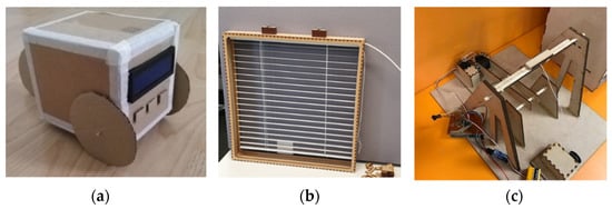Design prototypes produced by the teams of students. (a) Case study 1: escaping clock; (b) case study 2: smart blinds; and (c) case study 3: catapult.