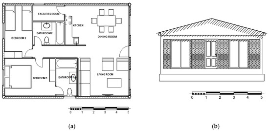 Given this context, the research focuses on single-family masonry housing, with concrete pillars and beams of 81.72 m2, two bedrooms, two bathrooms, one living room, one dining room, one kitchen, and a laundry area (Figure 2A), designed for three people. This type of housing has foundation walls that are 500 mm high by 400 mm wide, with 400 mm high by 200 mm wide footings. The external wall is made of 140 mm thick brick masonry. The roof contains galvanized steel trusses covered by asphalt roof tiles. The interior roof structure contains 60 mm mineral wool panels and, underneath, plasterboard, leaving an unventilated space. The floor consists of a 70 mm concrete floor slab with a 10 mm wood parquet. The windows are single-glazed and have an aluminum frame with no thermal bridge break.