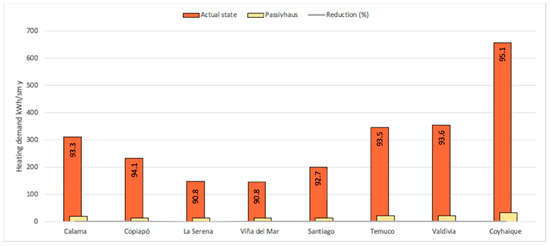 Once building improvement data were inputted to the PHPP, an energy comparison between the housing under study in each city and the PH housing was carried out. Figure 3 shows the heating demand results. The country average is 300.2 kWh/m2 per year. The country’s average heating saving is 93% after incorporating PH into housing. In terms of refrigeration, it is not necessary to implement active elements to cool indoor air. Since the indoor temperature does not exceed 10% of temperatures over 25 °C, there is no overheating and no refrigeration demand as the controlled ventilation machine with heating recovery is responsible for this. This study considered the machine as a passive element as it requires a small amount of energy to operate.