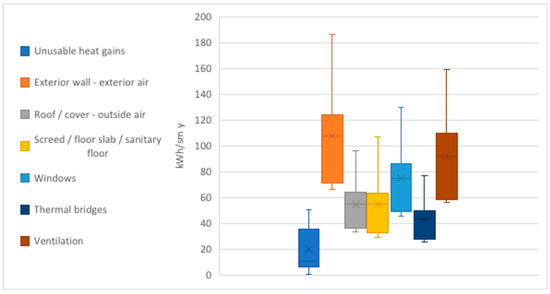 Most energy loss occurs through exterior walls, then through ventilation, windows, roofs, floor slabs, thermal bridges and, finally, through non-usable heat gains.