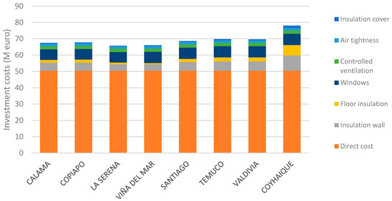 Implementing PH resulted in an average increase of 37% in construction costs for the country. Windows and wall insulations were identified as the highest costs (Figure 5), at 10% and 8%, respectively. In second place, floor insulation and ventilation experienced an investment increase of 3% each, followed by airtightness at 2% and roof insulation at 1%.
