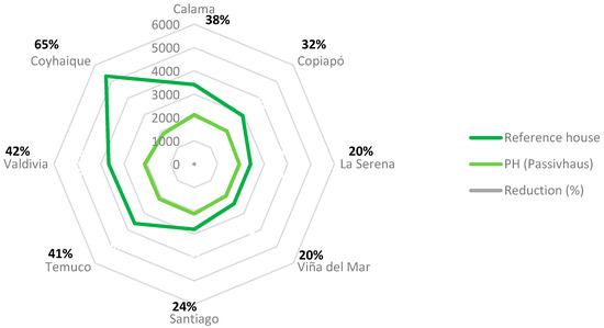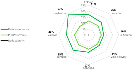 The environmental analysis of this research is based on two indicators: primary energy and CO2 emission. Primary energy is the energy consumed by a house (heating use, refrigeration, domestic hot water, and lighting) plus storage and distribution energy. Energy consumption is defined as energy demand multiplied by a facility’s efficiency factor. In this context, the savings noted in this research (Figure 7) as resulting from incorporating the PH standard into Chile’s housing are 32% (country average). These savings are significantly noticeable in the south of the country, reaching 57%.