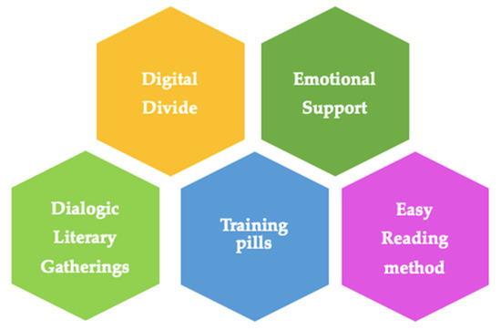 Dialogic Literary Gatherings have been featured in a series of successful educational actions. In 1997, Ramón Flecha, a professor at the University of Barcelona, launched “Learning Communities,” a project aimed at achieving social and educational transformation. It featured several successful educational actions, including a series of Dialogic Literary Gatherings. On the other hand, it is necessary to highlight other essential constructs associated with innovative and inclusive education, such as socio-emotional education (scientific program approaches such as Seligman’s positive psychology [43], etc.) and “Easy Reading” (the adaptation of the act of reading to an inclusive understanding a series of different groups with reading difficulties). Learning communities are the response to social and educational transformation as a consequence of the information society [12,27,32,45]. In this educational model, two key factors for current learning stand out—interactions and community participation [26,45,46,47]. The classroom is conceived as a meeting place in which the adult volunteers are engaged in educating the participating children, taking a diversity of social aspects, cultural tendencies, and religious backgrounds into account [27]. Prestigious universities such as Harvard or University of Illinois have turned this diversity of students and volunteering into a factor of educational excellence [48,49].