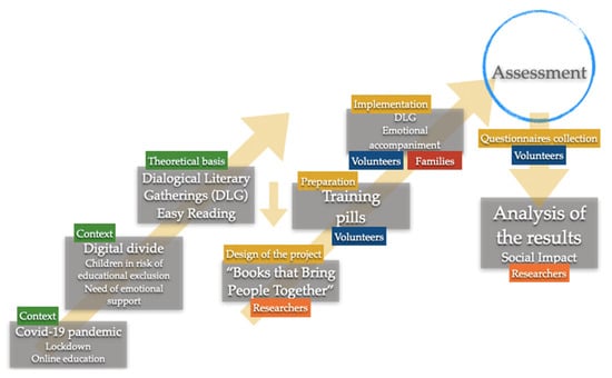 The intervention was carried out from 1 June 2020 to 10 July 2020. It consisted of telematic (online and/or by phone) emotional accompaniment through books, in the form of Dialogic Literary Gatherings. In general, the intervention was carried out in four sessions of 45 min with three children each. During and after the intervention, the different questionnaires were administered to measure formative and motivational impact, evaluation of the development of volunteer competencies, and family satisfaction. The training pills we used, along with the materials, resources, etc. (necessary if the reader desires to replicate said intervention), can be found on the XXXXX project website (anonymized during the review process). The research model and project procedure are summarized in Figure 2.