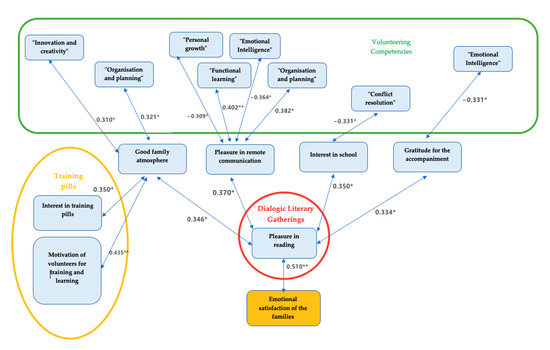 On the other hand, expanding the model shown in Figure 4, we placed the variables regarding volunteers’ and families’ experience (now focusing on “pleasure in reading”), volunteer competencies, and volunteer training in relation to one another. Once again, very interesting correlations can be observed. From the perspective of volunteers, as we have seen, the emotional satisfaction of families was related to the increase in the pleasure of reading fostered by the literary gatherings (r = 0.510 **), and this pleasure in reading was also related to a good family atmosphere (r = 0.346 *). In this sense, the results show that the participation of the volunteers in the information pills was related to this perception of a good family environment, both due to the interest (r = 0.350 *) and the motivation (r = 0.435 *) that these training pills aroused in them. The relationship between the volunteers’ evaluation of the experience variables and the competence variables also yields relevant results. For example, the perception of a good family environment after carrying out the activity is positively related to the competencies of “innovation and creativity” (r = 0.310 *) and “organization and planning” (r = 0.321 *). There is a negative correlation, however, between the volunteers’ assessment of the participating children’s interest in the school and their ability to resolve conflicts (r = −0.331 *), and their assessment of family gratitude for the activity and the volunteers’ “emotional intelligence” (r = −0.331 *).