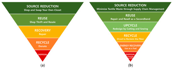 Given that the amount of textile waste has increased exponentially, researchers, manufacturers, and consumers have paid greater attention to textile waste management and disposal practices. Considerable research has examined textile waste hierarchy. For example, ReThread DC, the District of Columbia’s textile reuse and recovery initiative, suggested a textile waste hierarchy to residents and consumers (Figure 1a). First, the most sustainable option is “source reduction” which aims to decrease the accumulation of clothing and other textiles. They proposed that residents shop and swap their own closets to avoid making unnecessary purchases. Second, “reuse” is a way to not damage the original form by reselling unwanted clothing and textiles or by purchasing necessary items from local thrift, resale, and consignment stores. Third, “recovery” extends the product life cycle by repairing clothing and textiles (e.g., patching small holes in pants, sewing on a button that has fallen off). Fourth, “recycle” is a way for unwanted clothing and textiles to not end up in the trash. If items that are dry and clean are donated regardless of their condition, secondary markets will purchase unsellable clothing for use as rags and for industrial fill material. Lastly, “disposal” is the least preferred method of disposal since clothing and textiles end up in a landfill, contributing to the production of lethal gases that cause climate change.