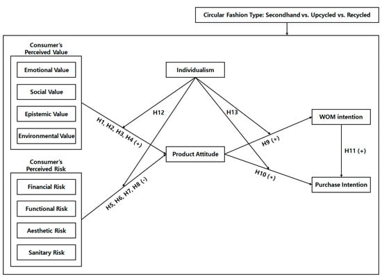 Despite this trend, research on circular fashion has only been conducted at the basic level. Most previous studies have analyzed the characteristics of reused and recycled fashion products from an aesthetic dimension or have analyzed the overall concepts of sustainable fashion such as eco-friendly fashion, eco-fashion, and green fashion from a marketing perspective. Accordingly, it is necessary to broaden our academic and practical understanding by more specifically examining consumers’ perceptions of circular fashion. Thus, this study aimed to investigate consumers’ perceived values and perceived risks related to circular fashion. Specifically, we divided the types of circular fashion into three sub-dimensions (secondhand clothing, upcycled clothing, recycled clothing) and examined the differences in the impact of consumer perceptions on product attitudes and behavior intention for the three types of circular fashion. This study also aimed to determine the moderating effect of individualism, which is a known general value of Millennials and Gen Z. Marketing research has shown that individual values may be a predictor of consumer behavior since these values are present extensively throughout consumer processes, including the formation of consumer attitudes, information processing, and purchase of goods. Thus, it is expected that individualism could moderate not only the relationship between perceived dimensions and product attitudes but also the relationship between product attitudes and behavior intention. The findings of this research will expand our academic knowledge by providing more in-depth knowledge and a more integrated view of consumers’ responses to circular fashion. Furthermore, it will offer insights for retailers by providing information on which values should be emphasized and which risks should be reduced in the sale of circular fashion products.