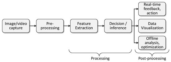 Figure 1. The pipeline starts with video data retrieved from one or more cameras capturing traffic scenes at deployed locations. The visual data are passed to the next stage, called pre-processing, which extracts image sequences out of the video stream and performs image enhancement operations such as brightness and contrast correction, distortion compensation, and noise filtering. This step also includes some preliminary tasks before processing the image in the next step such as resizing, cropping, and identifying regions of interest (ROIs). The third and fourth steps in the pipeline are feature extraction and decision/inference accordingly. Feature extraction is the process of transforming the raw data in pixels into higher quantitative data such as edges, histogram of oriented gradients (HOG) features [