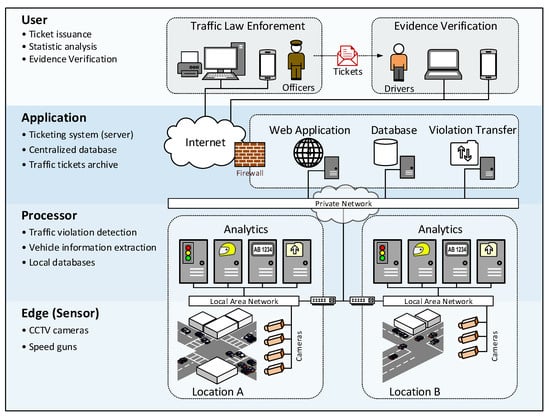 Among all methodologies mentioned previously, the use of computer vision techniques with CCTV cameras installed on the roadway infrastructure is best suited to traffic violation enforcement systems in developing countries due to the low cost of hardware and ease of maintenance. However, there are two main concerns that must be taken into consideration when deploying the system over a large physically distributed area. First is the computing resources required to process rich visual information that comes from video cameras, and second is the type of network infrastructure required to transmit high-bandwidth video streams from the cameras to the computing resources. As the number of deployments and the area of coverage increase, the budget required for system installation can increase dramatically. Hence, the design of the system architecture is critical to reducing the cost of initial installation and allowing the system to scale up with modest incremental investments.