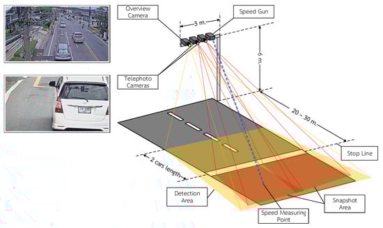 n cameras are equipped with telephoto lenses to take clear snapshots of traffic violators’ license plates (focusing on orange shaded areas). When an over-speeding violation is targeted at the location, additional measurement sensors such as speed guns can be installed alongside the cameras. All sensors are typically mounted on a single camera pole above the road in order to avoid occlusion of target vehicles. The cameras must point in the same direction as the traffic flow in order to capture the vehicle from the rear. Setting up the sensors in this way allow the capture of license plates of any kind of violating vehicles including motorcycles, which only have rear-mounted license plates in Thailand.