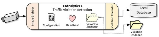 VInfo, defined by the dark orange rounded rectangle. It has the same architecture as the other analytics. However, instead of taking input from sensors or network cameras, it queries and retrieves evidence data from the local database. After extracting vehicle information, it uploads the result, containing violation evidence and metadata, to the server. With the benefit of the modular structure of all analytics,