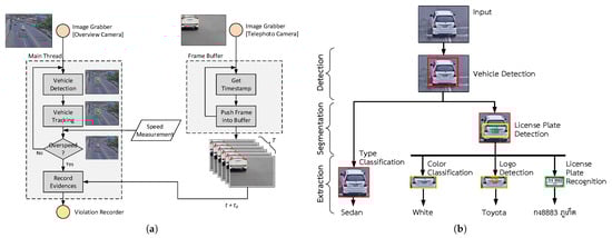 Figure 6a shows a flowchart of the red-light violation detection system’s operation. To simplify the system flow, there is only one stream from telephoto cameras shown in the diagram. However, in real scenarios, the number of telephoto cameras should be equal to the number of traffic lanes. To handle the multiple concurrent video streams, the red-light violation detection system spawns a separate process to handle each stream.