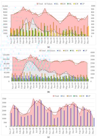 Figure 9. The red doted lines and gray dashed lines are trend lines showing a basic 3-month moving average of the number of violations and the number of citations respectively. In case of red-light and helmet violations, the number of violations in the months after the police started issuing traffic tickets decreased gradually: The number of red-light violations dropped from ∼8000 cases/month in the beginning of 2018 to ∼6000 cases/month in the end of 2019 and the number of helmet violations dropped from ∼100,000 cases/month to ∼90,000 cases/month in the same period of time. However, we can observe that this reduction did not occur for speed violations. This is due to the fact that there were no speed citations issued, due to the concern described in
