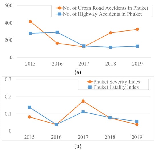 Figure 11a shows that, since 2017, the number of highway accidents in Phuket has decreased, while the number of urban accidents has risen. DRSSA was deployed primarily on highways, so it likely had impact on highway accidents but not traffic accidents in the denser urban areas. However, clearly, highway accidents are more severe than urban accidents, the reason for the choice of highway locations for the deployment in the first place. Furthermore, as shown in