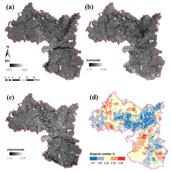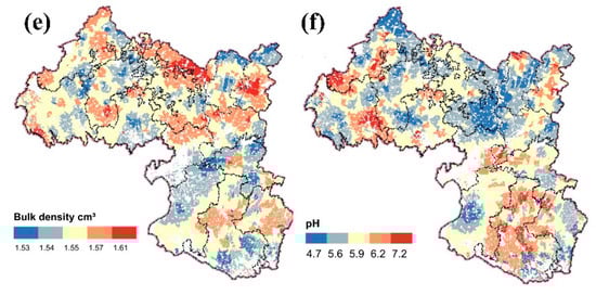 Landsat 8 data in August 2020 was used in this study. Prior to image analysis, we performed remote sensing image preprocessing in ENVI software. The soil color index (SCI) reflects the content of humus in the soil, Figure 1a, humus can absorb potentially toxic elements in the soil [22], preventing possible harm caused by their continuous diffusion in the soil and thereby reducing pollution [23]. Iron oxide is an important component of soil, yellow soil contains more hydrated iron oxide. Red soil forms iron bauxite under the action of desiliconization and aluminum enrichment [24], Figure 1b. Clay minerals reflect the distribution and content of clay in the study area, Figure 1c; its adsorption has an important influence on the content of trace elements in the soil [25]. Carboxyl, hydroxyl, carbonyl, phenolic hydroxyl, methoxy, aldehyde, ether, amine, etc. are the most important functional groups of organic matter. It is these large number of functional groups that produce high reactivity, so they can interact with metals in the environment, Figure 1d. Frequent interactions of ions influence the content of potentially toxic elements in the soil [26]. Soil bulk density is an important indicator reflecting soil porosity and permeability, Figure 1e. Potential toxic elements will dissolve, precipitate, complex, and adsorb in the soil [27]. The pH value of the soil affects the effectiveness of potentially toxic elements, Figure 1f. Studies have found that when the pH value in the soil is higher, the reactivity of potentially toxic elements will be significantly reduced, making it difficult for them to be absorbed by plants [28].
