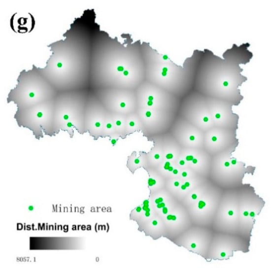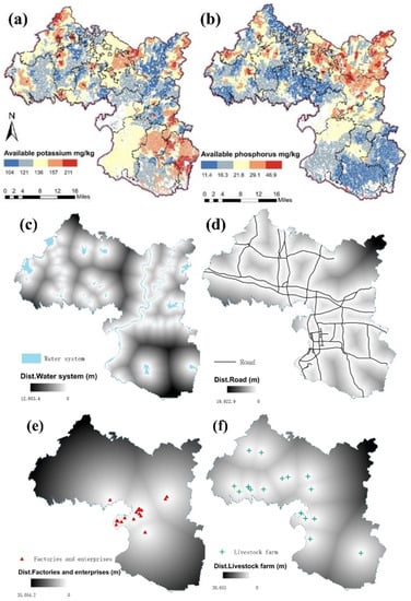 The available phosphorus and potassium can reflect the cumulative impact of artificial fertilization on the levels of potentially toxic elements in soil, Figure 2a,b. The water system, roads, industrial enterprises, livestock farms, and mining areas were analyzed in ArcGIS software using the Euclidean distance to obtain the sample point, close to the water system and construction land, Figure 2c–g. The distances between them can illustrate the influence of human conducts on the soil environment, such as transportation, irrigation, and artificial breeding [29].