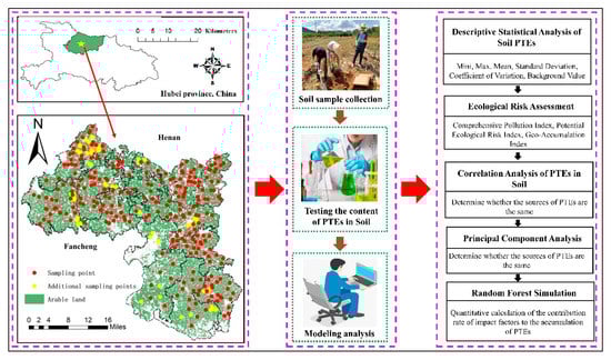 A research framework with the association of multivariate statistical analysis, ecological risk assessment, correlation analysis, principal component analysis, and random forest model was built using five main steps: statistical summary, correlation analysis, principal component identification, source dedication calculation, and effect procedure analysis of important factors. Through statistical summary, the concentrations of each potentially toxic element in the study area would be revealed. Through ecological risk assessment calculation, the risk assessment integrates data from ecological risk assessment models, toxicology, and soil pollution research to assess the risks and harms that pollutants pose to environment [30]. Through correlation analysis and principal component analysis, in IBM SPSS Statistics 19 software, the main pollution sources could be determined for the study area. Then through random forest simulation, detailed sources’ contribution ratio could be acquired, and the key environmental variables would be selected to indicate the effect procedure of artificial and natural indicators on potentially toxic elements in soil.